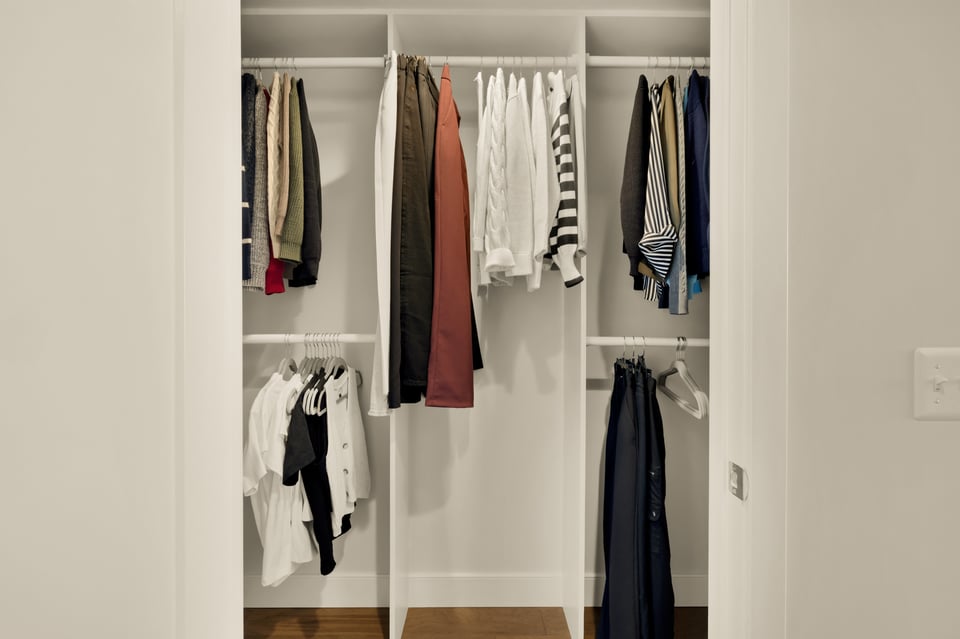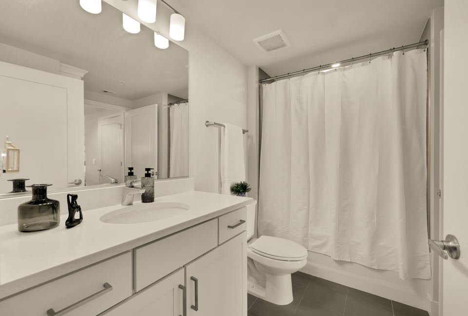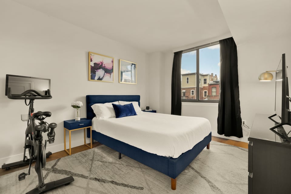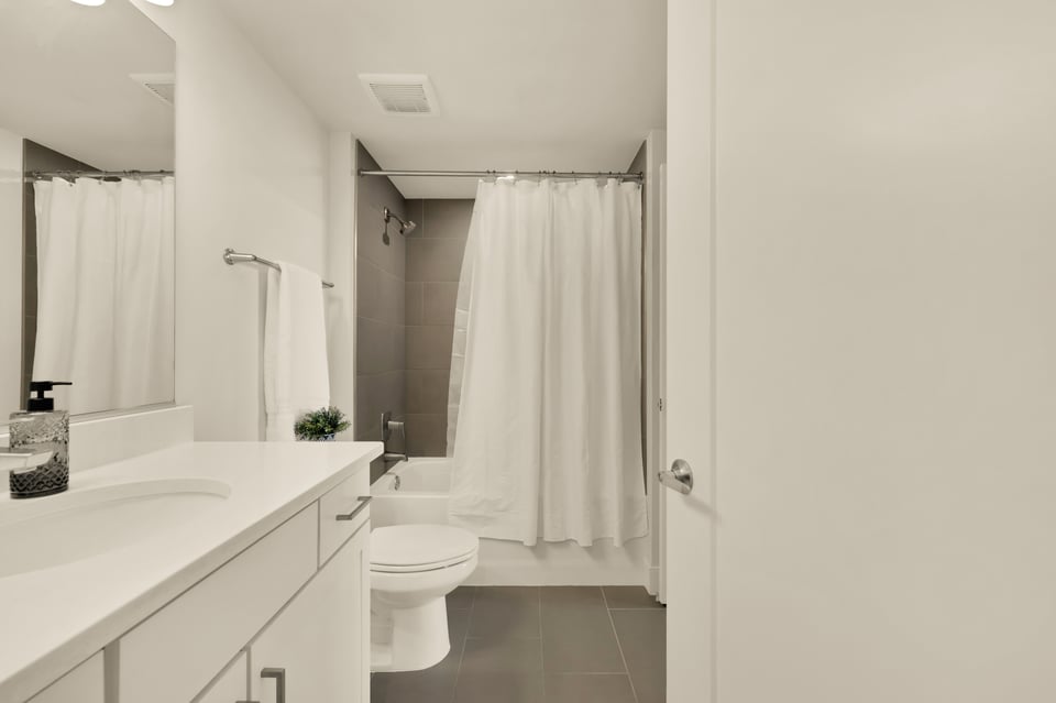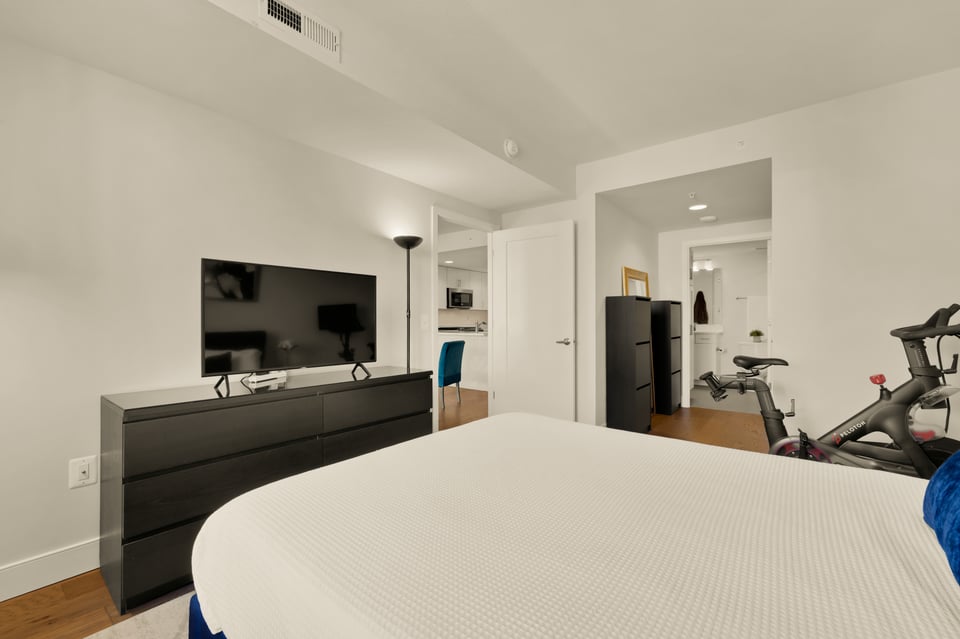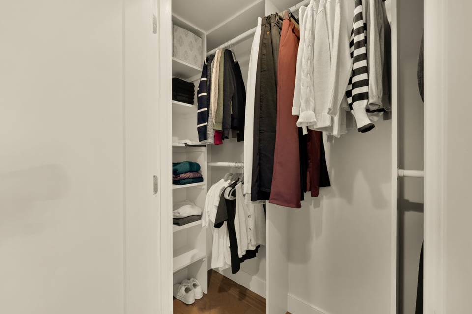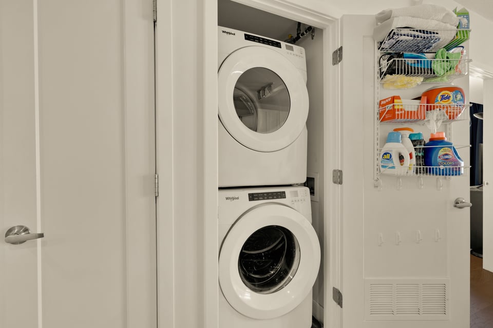 The bedroom serves as a true retreat, boasting a walk-in closet with a custom organization system and direct access to the updated double-entry bathroom featuring a soaking tub. A full-sized in-unit washer and dryer ensure total daily convenience.