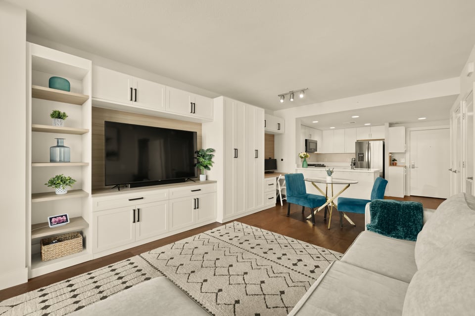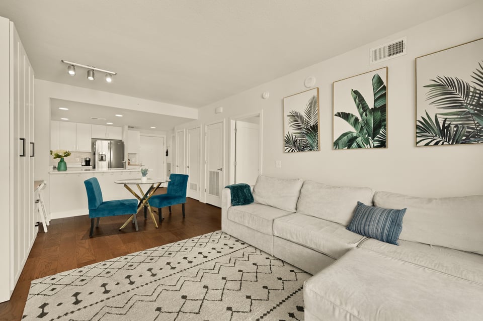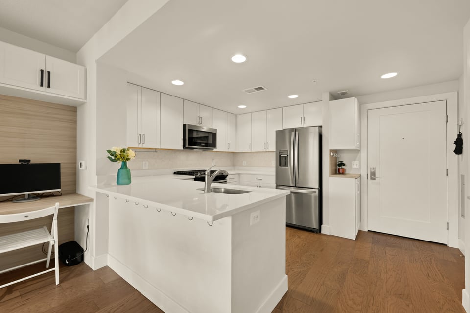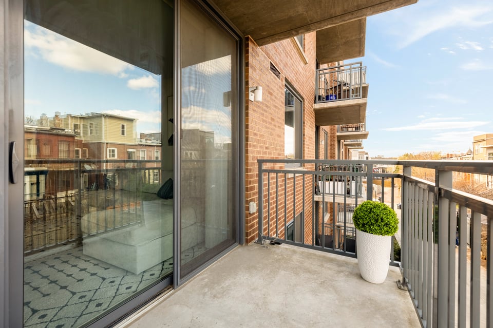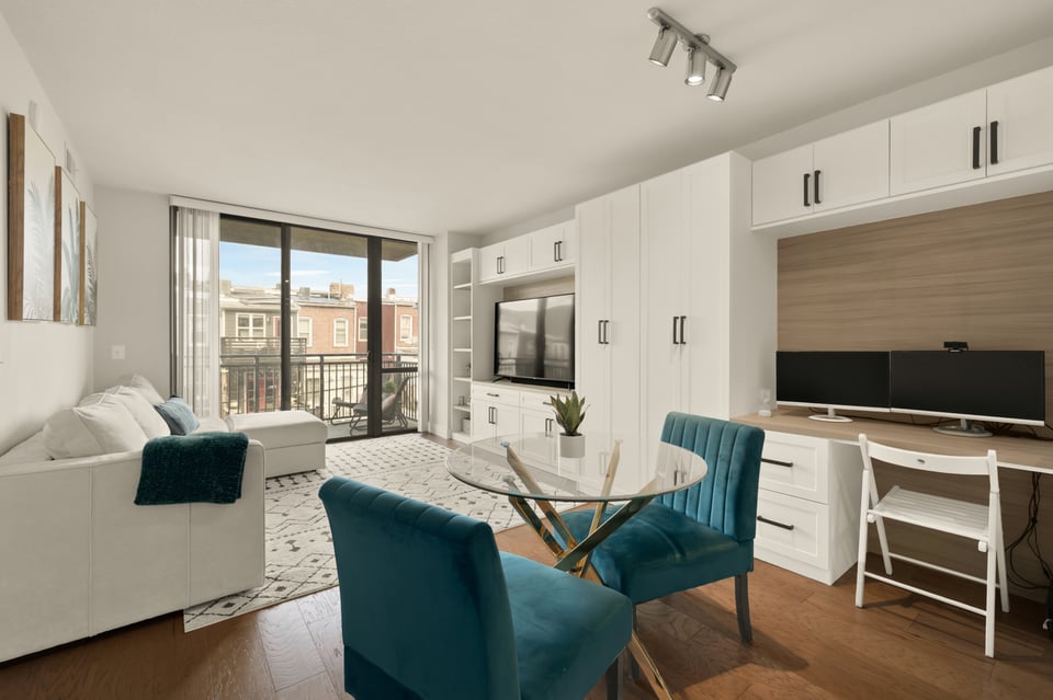 Step into the bright open floor plan featuring 5" hardwood floors and recessed lighting, with a spacious gourmet kitchen including shaker cabinetry, quartz countertops, a chic herringbone tiled backsplash, and premium stainless steel appliances (gas stove). Flowing effortlessly from the kitchen, the living and dining areas are defined by unique, floor-to-ceiling custom built-ins. These designer installations provide a dedicated home office, integrated shelving, and massive storage capacity, allowing for a minimalist, clutter-free lifestyle that is rare in condo living. Just off the living area, a private balcony overlooks the neighborhood—perfect for relaxing with your morning coffee.
